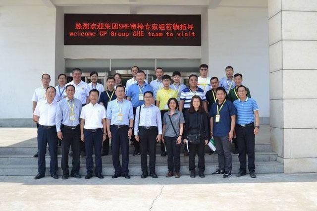 2019年6月18日,正大集团泰国总部可持续发展部与中东南区领导及SHE有效性评估审核组一行15人莅临洛阳正大审核指导SHE方面工作。参加审核评估的集团可持续发展部领导和专家有:***副总裁Mr.Anek Buranapakdee林志诚、副总裁Mr.Petch Petchmanee杜平、助理副总裁Ms.Lalana Kanokchaipramote叶楚会、总经理Ms.Anchalin Wongskittivimon汪小玲,中东南区领导和专家有:张绍安***总裁、张铜锤副总裁、陈克贝助理副总裁、黄德龙助理副总裁等11人。洛阳正大食品王学斌***总裁、沈道华副总裁及各部门负责人接受了考核评估。