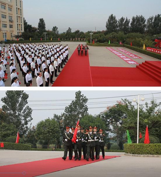 早上八时零八分,升旗仪式正式开始,在雄壮的军乐声中,飒爽英姿的护旗手迈着整齐的步伐护送国旗走向升旗台。雄壮的《义勇军进行曲》响起,鲜艳的五星红旗冉冉升起,迎风飘扬,全体员工手持鲜艳的五星红旗行注目礼,共同高唱国歌,表达对新中国的崇敬和热爱。